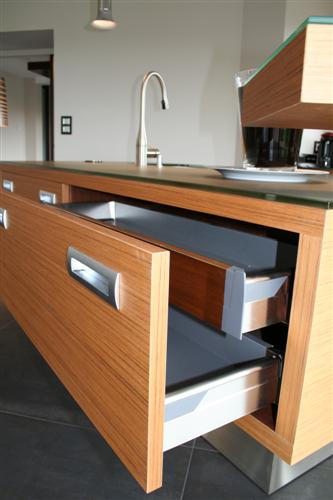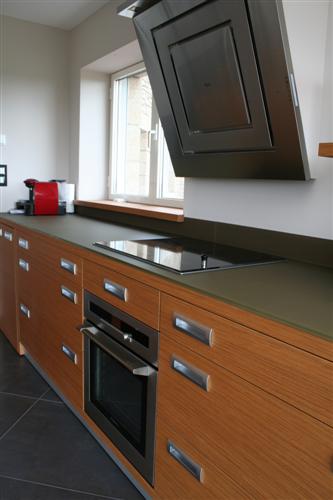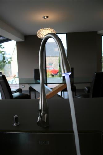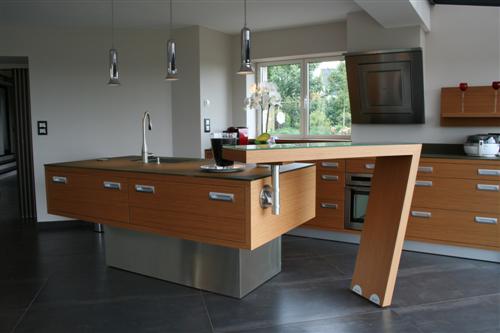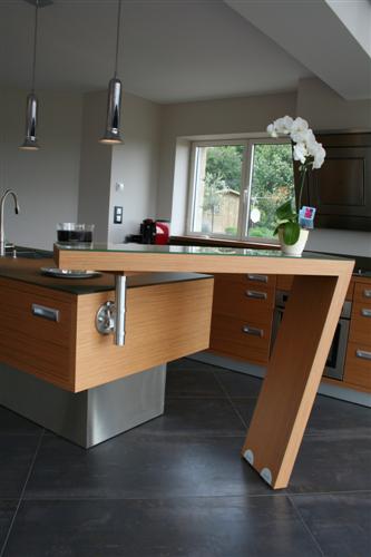 Très tendance, tant par son design contemporain que par son implantation ouverte sur le séjour, cette cuisine allie élégammant modernité et convivialité. Le bar pivotant parfait le tout pour en faire une cuisine ergonomique.