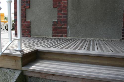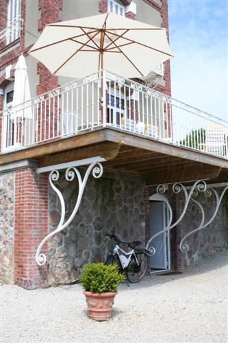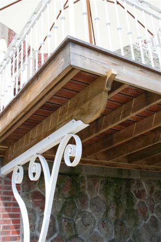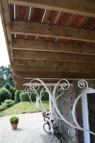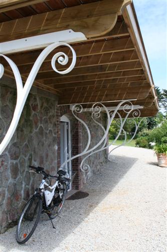 Conception et réalisation d'une terrasse suspendue avec jambe de force en fer forgé pour une maison du Cotentin